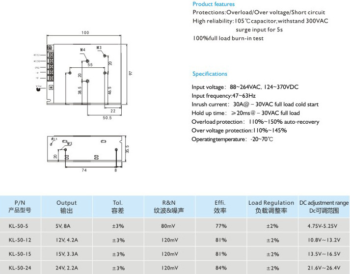 高可靠性:105C長壽命電容,能承受300VAC輸入電壓5秒不損壞 100滿載老化測試 輸入電壓:88-264VAC124-370VDC 輸入頻率:47~63Hz 沖擊電流:30A@-30VAC滿載冷態(tài) 保持時間:≥20ms@230VAC滿載 過載保護(hù):110%-150%自動恢復(fù) 過壓保護(hù):110%~145% 運行溫度:-20-70℃" />