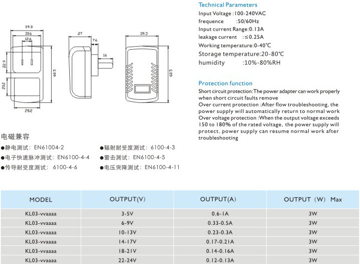 頻率:50/60Hz 輸入電流:0.13A 漏電電流:≤0.25A 工作溫度:0-40℃ 貯藏溫度:-20-80℃ 濕度:10%-80%RH 短路保護(hù): 電源適配器在短路解除時(shí)能正常工作恢復(fù) 過(guò)流保護(hù):過(guò)流故障排除后,電源將自動(dòng)恢復(fù)正常工作 過(guò)壓保護(hù):當(dāng)輸出電壓超過(guò)額定電壓的150-180%時(shí),電源將保護(hù),故障排除后電源能恢復(fù)正常工作" />